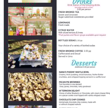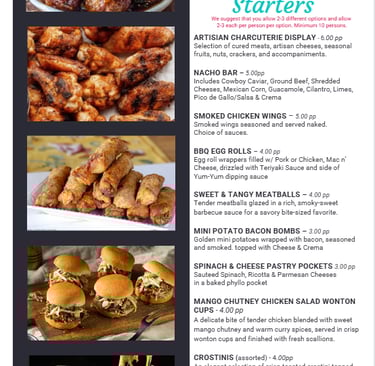 PLEASE NOTE: Prices listed do not include sales tax, travel/delivery, wait staff, service charges, or gratuity. A deposit is required to secure your event date. Our menu is a guide to what we offer, and we’re happy to customize options to match your vision and budget. Schedule a FREE consultation so we can create a menu your guests will never forget!