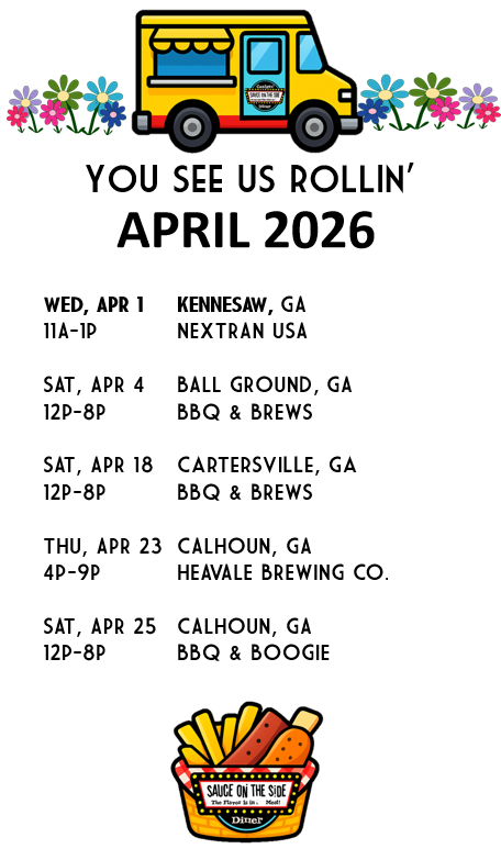 Sauce on the Side is based in Cartersville, Georgia, and proudly serves Metro Atlanta, North Georgia, and surrounding areas with full-service catering, food truck service, and event catering for weddings, corporate events, private parties, festivals, and special occasions.
