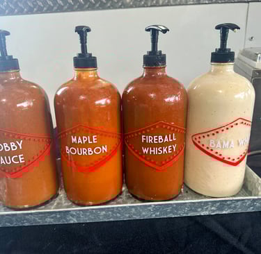 Mobile catering with our signature mouth-watering BBQ and more! Pickup or Delivery. Your guests will be delighted to treat themselves to our mouth-watering BBQ and more. Disposable pans and wire stands, sterno warming fuel, and serving utensils are provided. Plates, napkins, eating utensils and cups are provided at an additional cost per person.
