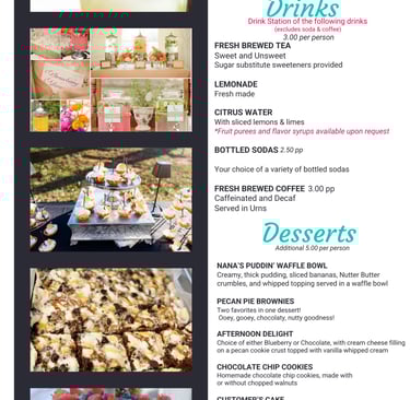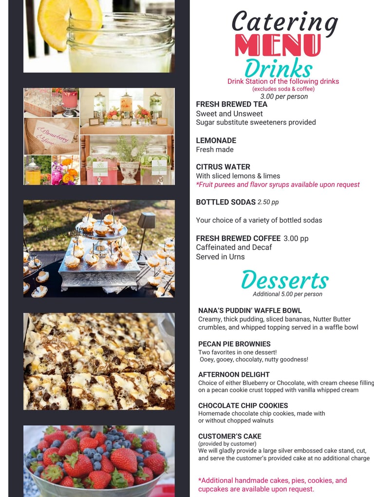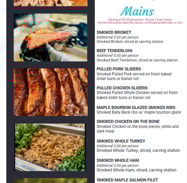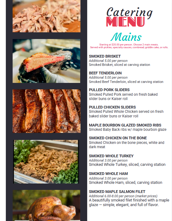 PLEASE NOTE: Prices listed do not include sales tax, travel/delivery, wait staff, service charges, or gratuity. A deposit is required to secure your event date. Our menu is a guide to what we offer, and we’re happy to customize options to match your vision and budget. Schedule a FREE consultation so we can create a menu your guests will never forget!