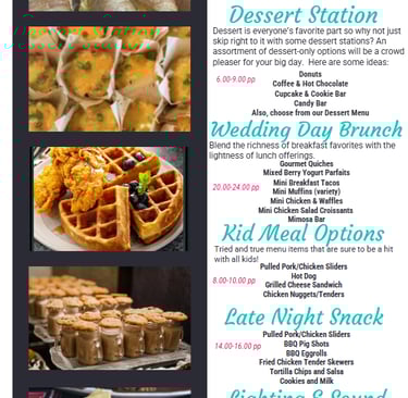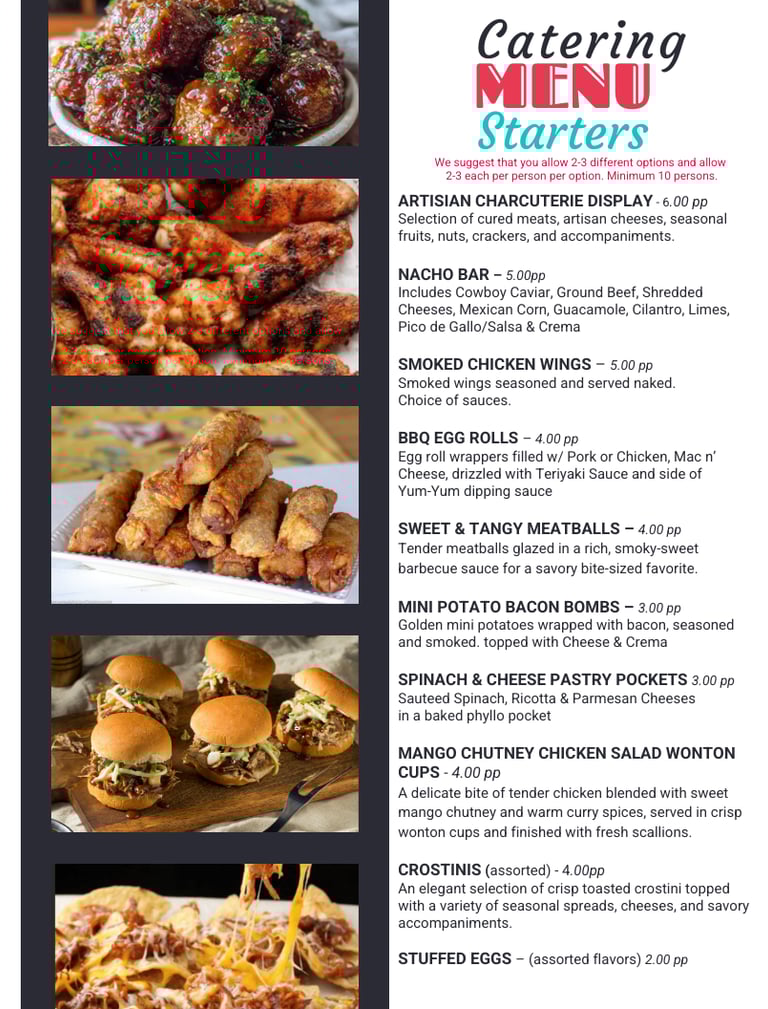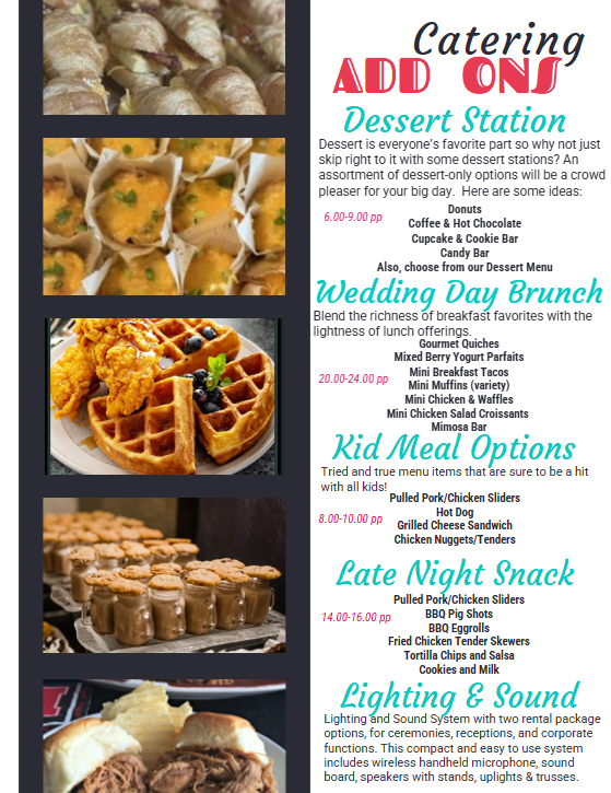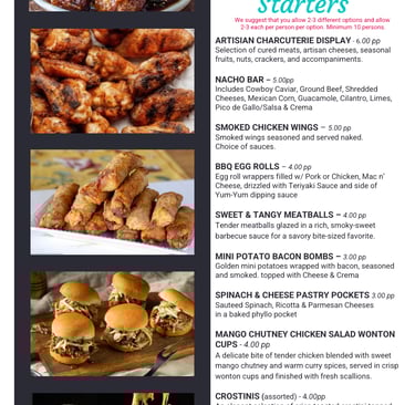 PLEASE NOTE: Prices listed do not include sales tax, travel/delivery, wait staff, service charges, or gratuity. A deposit is required to secure your event date. Our menu is a guide to what we offer, and we’re happy to customize options to match your vision and budget. Schedule a FREE consultation so we can create a menu your guests will never forget!